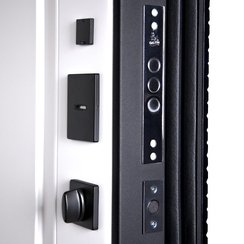 Тип открывания: Правое и левое. | Дверная коробка: 3 контура уплотнения. Толщина (глубина) коробки 118 мм. | Петли: 3 петли с подшипником | Полотно: 100 мм. | Покрытие: Порошковое покрытие "муар черный". | Внутренняя отделка: Экошпонированная панель МДФ 16 мм (цвет "белый матовый"). Объемная фрезеровка. | Замок нижний: Биометрический врезной замок Smart lock Y12. Замковая часть адаптирована под замену на биометрическую дверную ручку Smart lock T888 (ручка приобретается отдельно) или биометрический замок Smart lock DZ 888 (замок покупается отдельно). Также можно произвести замену на биометрический замок Smart lock Y23 (замок покупается отдельно в комплекте с механическим замком Galeon 809 (цилиндровый). Биометрический замок также можно заменить на механический Galeon 816 (цилиндровый замок приобретается отдельно). | Замок верхний: Galeon 817 (сувальдный). | Фурнитура: Ручка, ночная задвижка, глазок на квадратной розетке (цвет «черный»). Смотрите также: ДВЕРНЫЕ ГАДЖЕТЫ | Дополнительно: Евроцилиндр К-В перфокарта. Броненакладка врезная. Штырь противосъемный (3 шт). Порог из нержавеющей стали (цвет "хром"). | Утепление: Базальтовый утеплитель. | Размер и вес блока: 2050мм х 880мм - 100кг; 2050мм х 960мм - 110кг. | Упаковка: 2150мм х 1050мм х 140мм; 2150мм х 1130мм х 140мм.